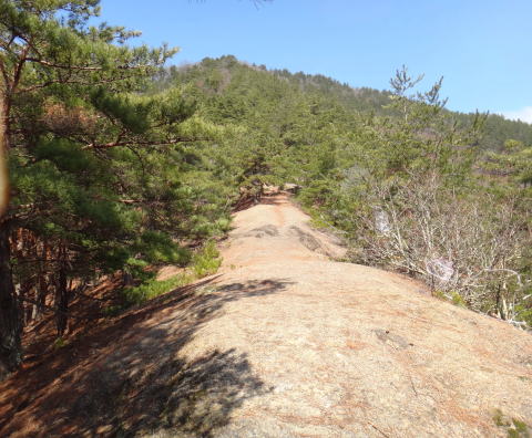 | 堀切を越えて登ります。途中、急な所は階段となっていました。 | ![]() |