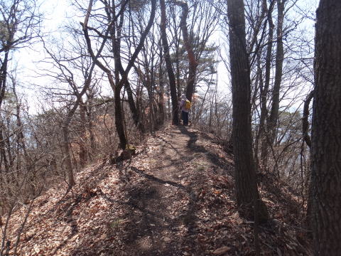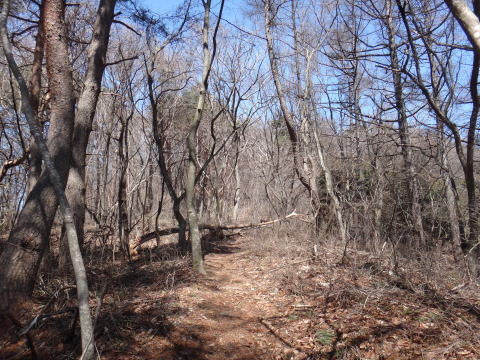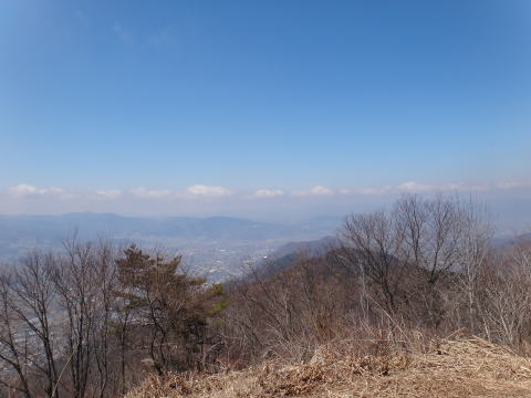 | 頂上からは北アルプスが見えるはずですが、今日は春霞がかかっているのか微かに見える程度でした。頂上であった登山者は冬に来ると最高の景色を楽しむことができるようです。雪もそんなに無いようです。 ピストンで戻りました。 |